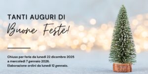 Si informa che gli uffici saranno chiusi per ferie dal 21 dicembre al 6 gennaio Eventuali ordini saranno presi in carico a partire da giovedì 9 gennaio. I migliori auguri di Buone Feste!